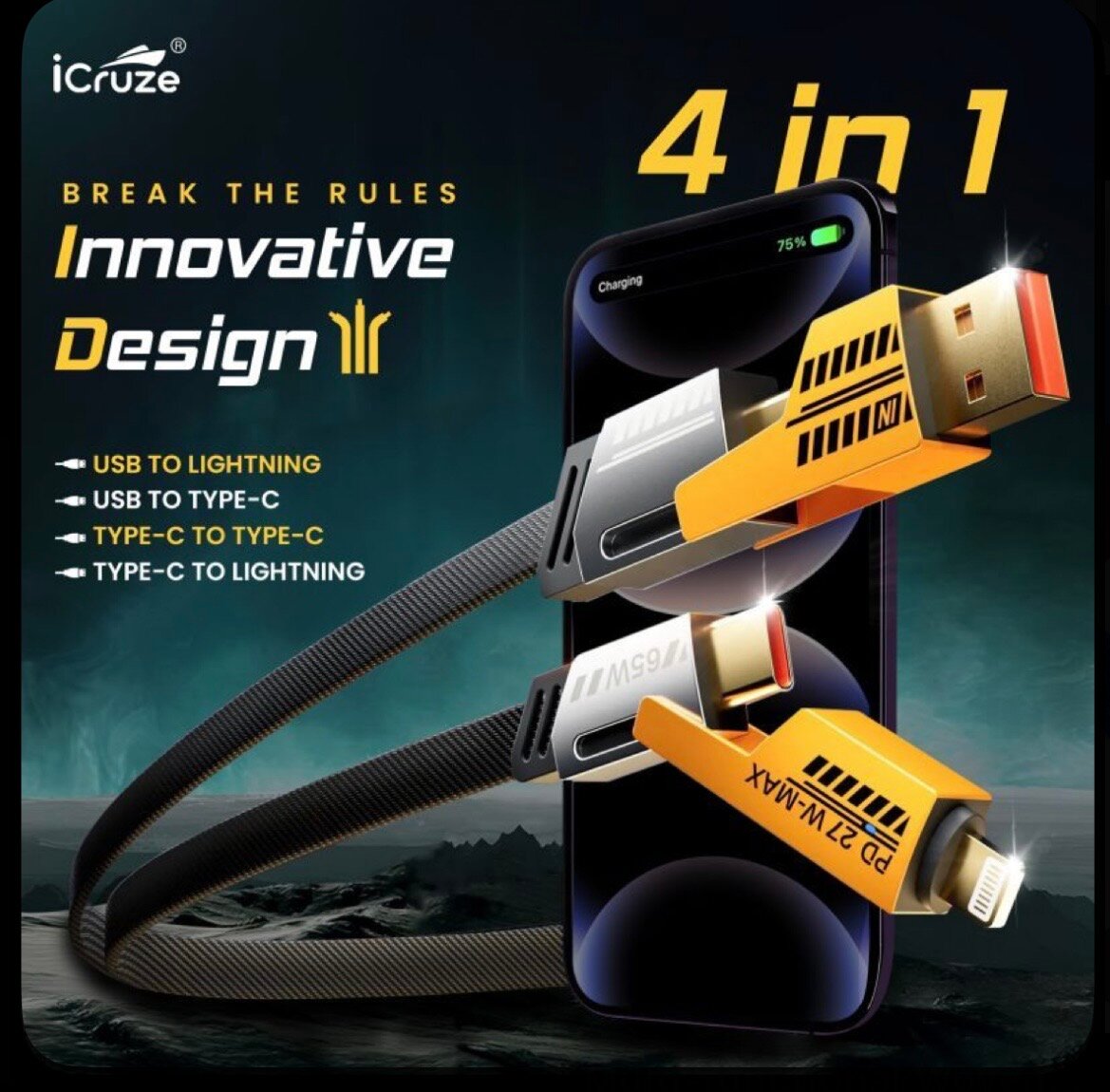 Découvrez le câble multifonction iCruze 4 en 1 : USB vers Lightning, USB vers USB-C, USB-C vers USB-C et USB-C vers Lightning. Design innovant et compatible avec vos appareils.