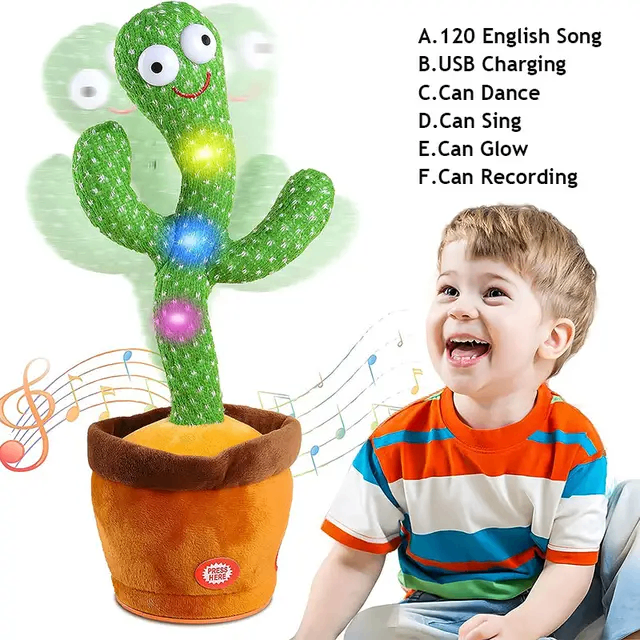 Cactus dansant avec lumières LED, chante 120 chansons anglaises. Recharge USB. Idéal pour divertir les enfants en mode danse et chant.