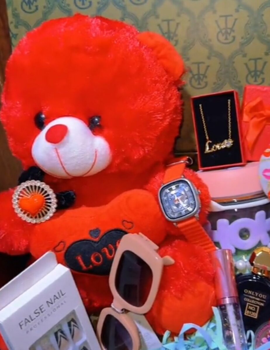 Offrez un cadeau inoubliable avec cet ensemble comprenant un ours en peluche rouge, des accessoires de mode et des produits de beauté. Idéal pour la Saint-Valentin ou tout autre occasion spéciale.