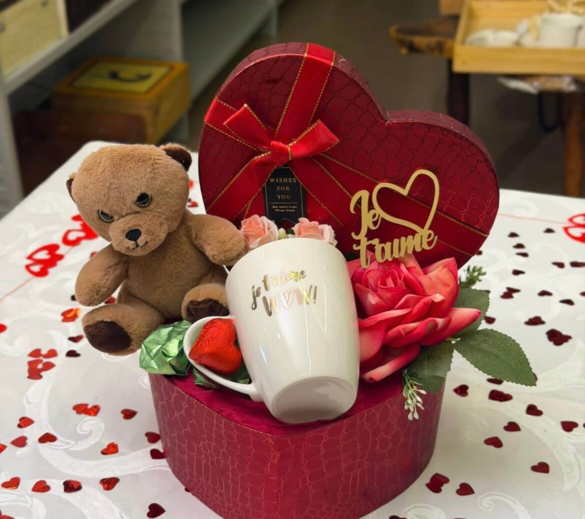 Un bouquet de fleurs avec une peluche et une tasse pour la St-Valentin. Cadeau romantique.