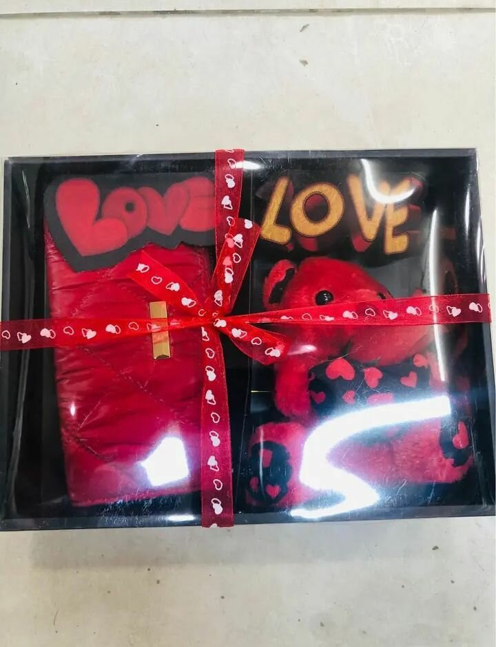 Ensemble cadeau Saint-Valentin comprenant un ours en peluche rouge avec des coeurs et un coussin LOVE. Idéal pour surprendre votre moitié. Emballage soigné et personnalisé.