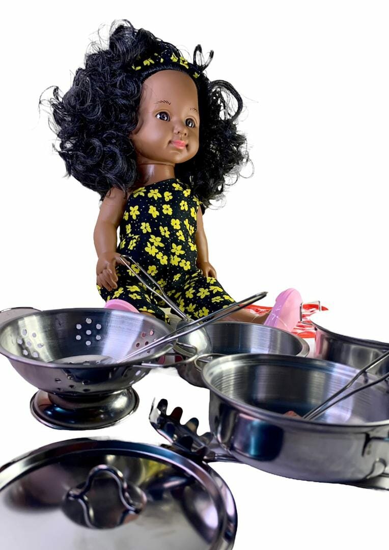 Dans ce coffret vous trouverez une poupée barbie africaine de 35cm, ses talons 👠 , son sac des chaises, des casseroles 🍽 frigo, étagère etc..