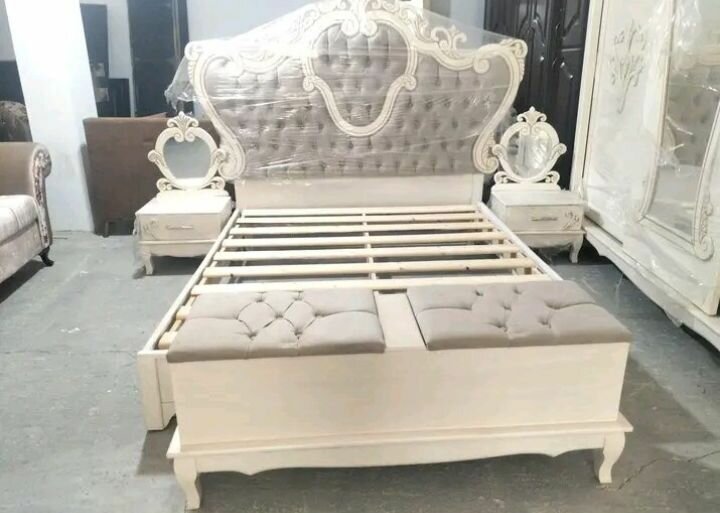 Découvrez ce somptueux cadre de lit en bois sculpté avec tête de lit matelassée. Parfait pour un intérieur élégant, ce lit offre à la fois style et confort. Le bois finement travaillé apporte une touche intemporelle à votre chambre.