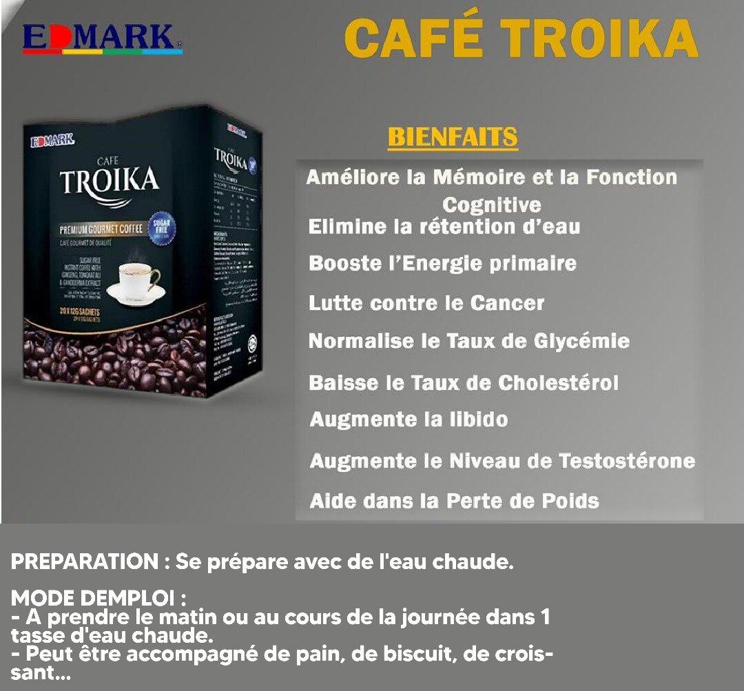 Découvrez Café Troïka Edmark, un mélange énergisant de café premium aux vertus stimulantes. Améliore mémoire, énergie et bien-être. Facile à préparer avec de l'eau chaude.