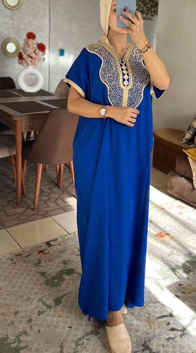 Caftan bleu pour femme, confortable et élégant. Idéal pour les occasions spéciales ou le quotidien. Conception raffinée avec détails dorés.