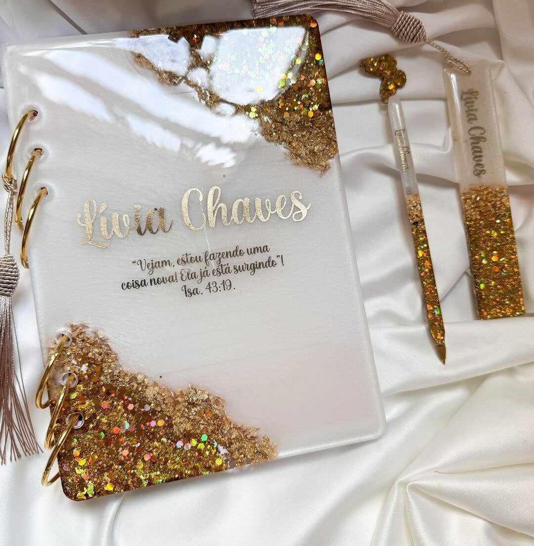 Optez pour un cahier confectionner en résine époxy élégant avec paillettes dorées, parfait pour vos notes ou journaling. Idéal pour les étudiants, professionnels et amoureux du style.