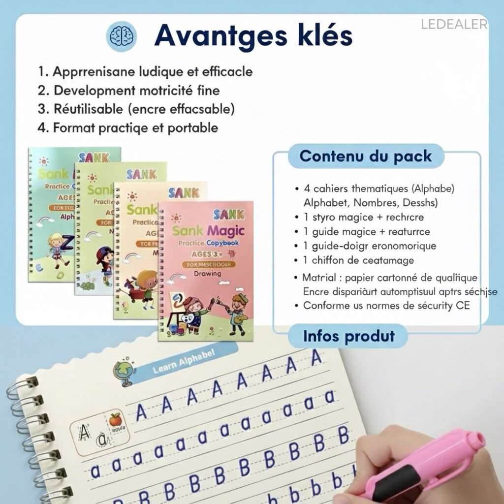 Boostez l'apprentissage des enfants avec ces cahiers magiques réutilisables. Parfaits pour développer la motricité fine et l'écriture. Contient 4 cahiers thématiques et un stylo effaçable.