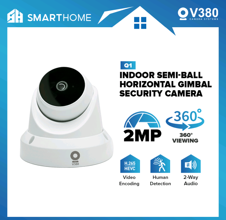 Caméra intérieure dôme V380 offrant une visualisation à 360°, détection humaine et audio bidirectionnel. Parfaite pour une sécurité domestique avancée avec connexion Wifi et qualité HD 2MP.