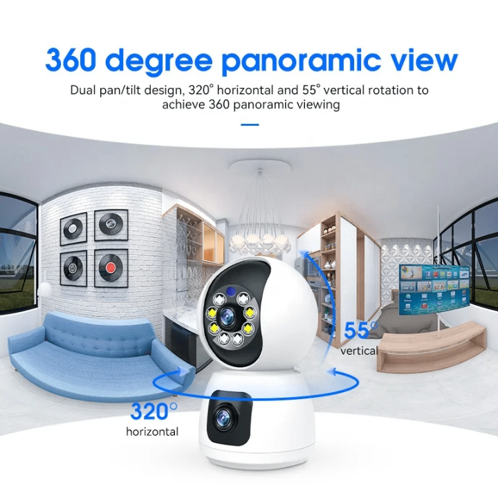 Découvrez notre caméra de sécurité innovante avec double objectif pour une surveillance complète sans angles morts. Grâce à sa vision panoramique à 360° et son design pivotant, elle couvre tout l'espace. Idéale pour sécuriser votre maison ou bureau.