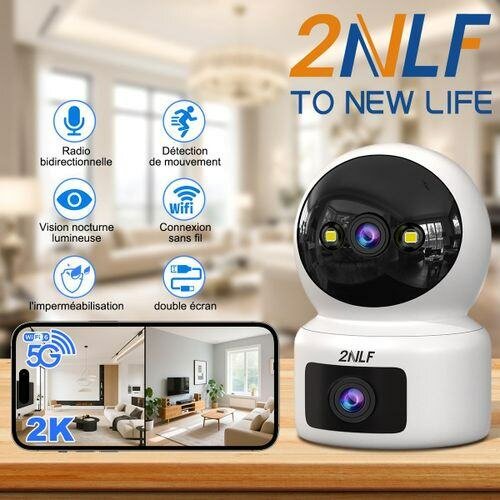 Caméra de surveillance 2NLF avec zoom numérique 15X et vision nocturne. Sécurité optimale grâce à la détection de mouvement et la radio bidirectionnelle. Installation facile et connexion WiFi pour surveiller à distance. Profitez d'une qualité d'image 2K et d'une couverture à 360°. Idéale pour la maison ou le bureau.
