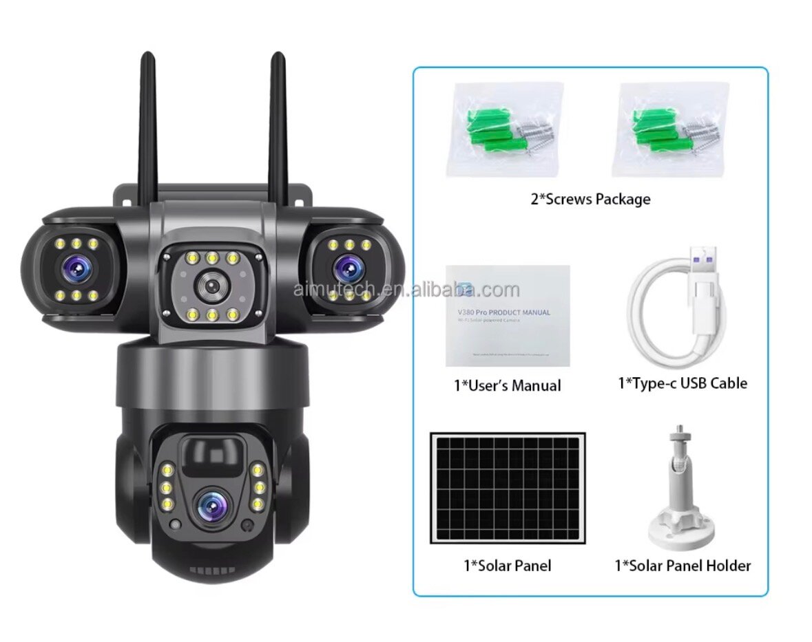 Caméra de surveillance solaire extérieure 3 objectifs avec panneau solaire et rotation motorisée. Résistante aux intempéries, idéale pour la sécurité de votre maison ou jardin.
