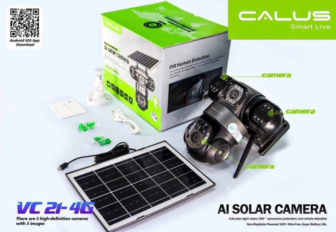 Caméra solaire extérieure CALUS AI avec détection humaine PIR et 3 caméras HD. Fonctionne sans fil avec panneau solaire. Idéale pour la sécurité de votre maison ou jardin.