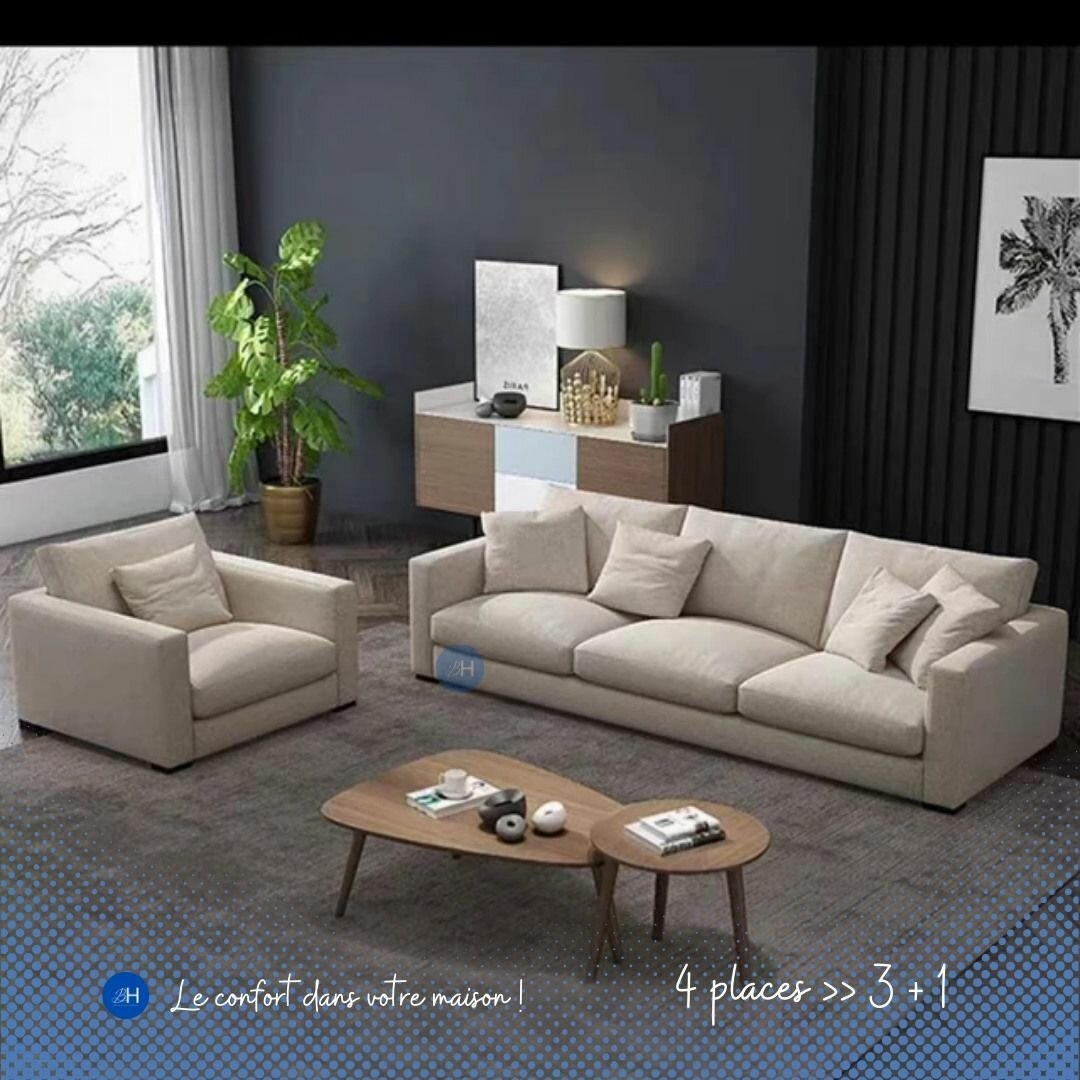 Canapé 4 places (3+1). En tissu, couleur beige. NB : Confection sur mesure (Maximum 1 semaine avant livraison).