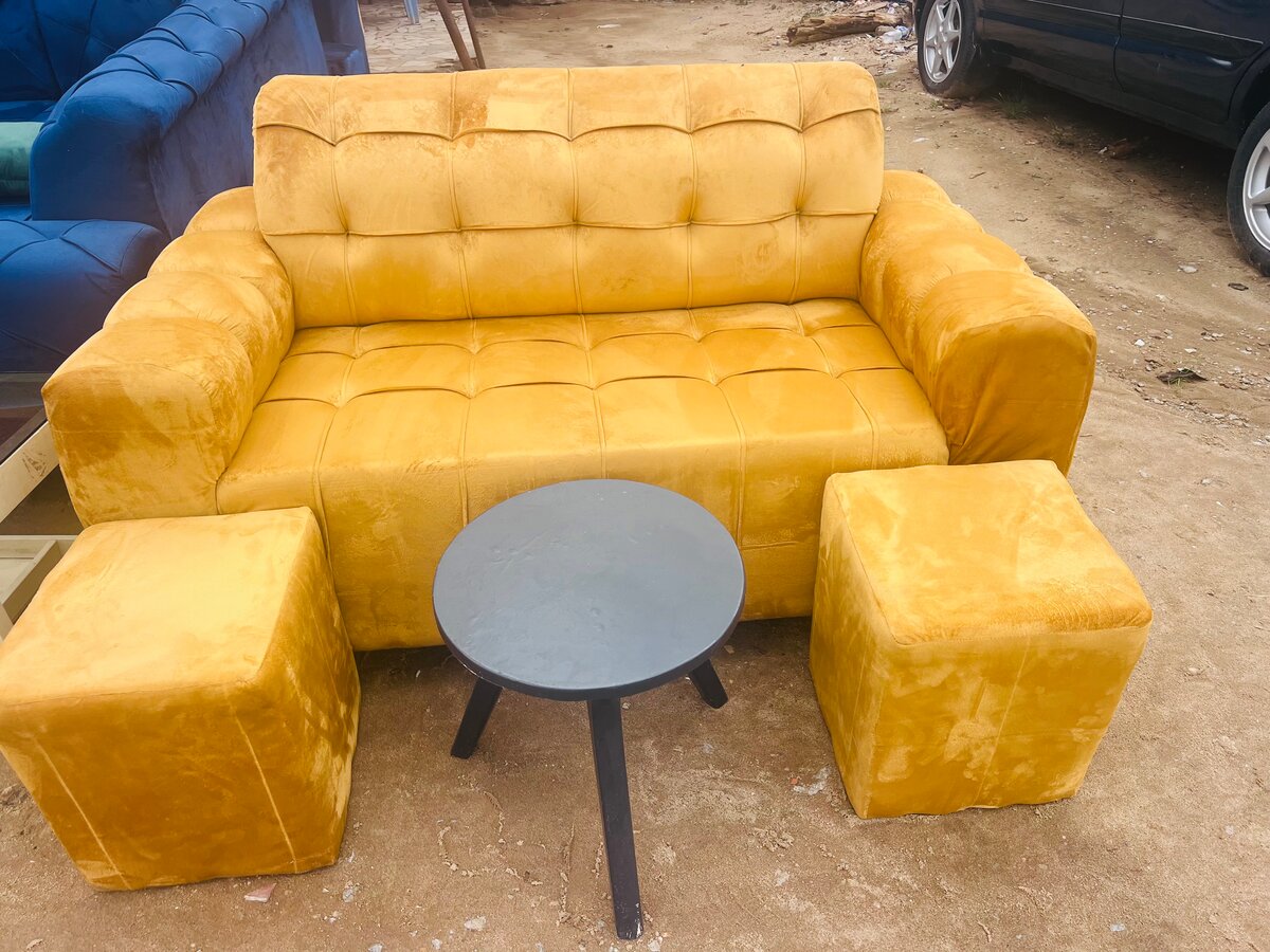 Découvrez ce magnifique canapé 2 places en velours jaune, idéal pour ajouter une touche élégante à votre salon. Confortable et stylé, il est accompagné de poufs assortis pour des moments de détente parfaits. Un choix idéal pour un intérieur moderne.
