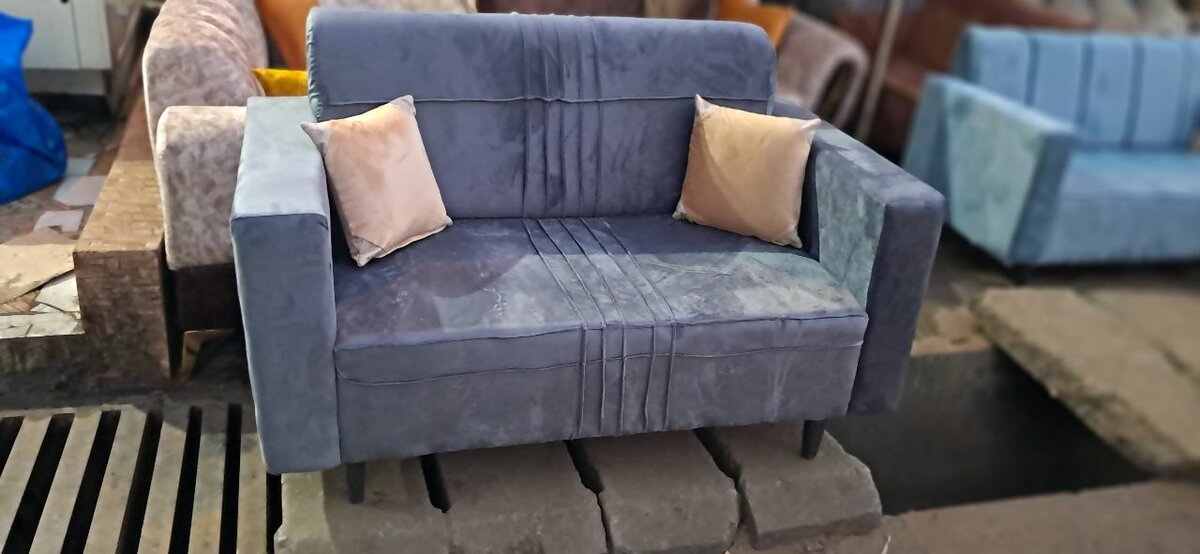 Découvrez ce canapé 2 places en velours bleu, parfait pour ajouter une touche moderne et confortable à votre salon. Avec ses coussins assortis, il offre style et confort pour vos moments de détente.