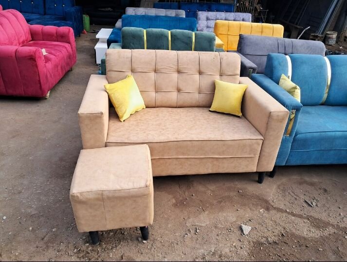 Canapé moderne en tissu velours avec ottoman. Confortable et élégant, idéal pour le salon. Disponible en différentes couleurs.