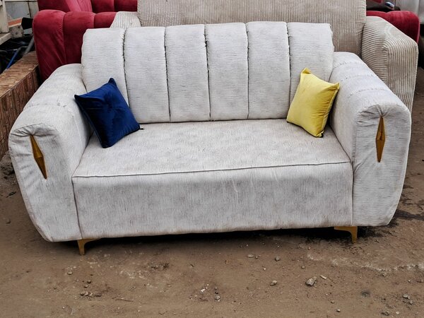 Élégant canapé 3 places en tissu blanc avec des lignes modernes et des pieds en métal doré. Parfait pour votre salon ou salle d'attente.