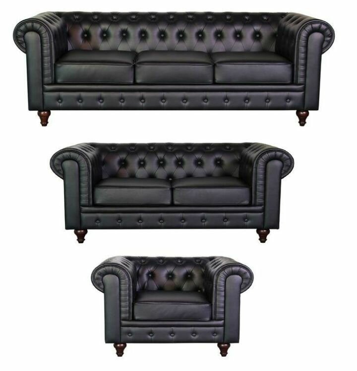 Ensemble de canapés en cuir noir de style Chesterfield. Conçu pour le salon, cet ensemble élégant et confortable comprend un canapé 3 places, un 2 places et un fauteuil. Le cuir de haute qualité et les finitions soignées offrent un look classique et intemporel.
