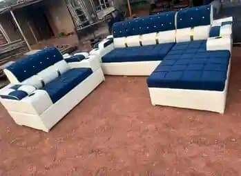 Canapé d'angle moderne en cuir blanc et bleu, idéal pour le salon. Conçu pour le confort et la durabilité.