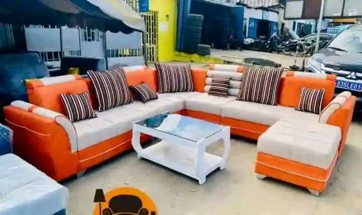 Canapé d'angle moderne en cuir orange avec coussins à rayures. Conçu pour le salon, il offre un design élégant et un confort optimal. Fabriqué avec des matériaux de qualité pour une durabilité exceptionnelle.