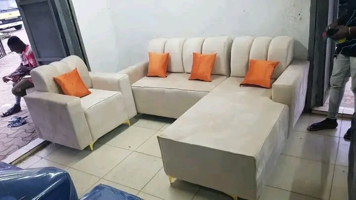 Ensemble salon complet : canapé d'angle, fauteuils et ottomane en tissu beige de haute qualité. Parfait pour les petits et grands espaces.
