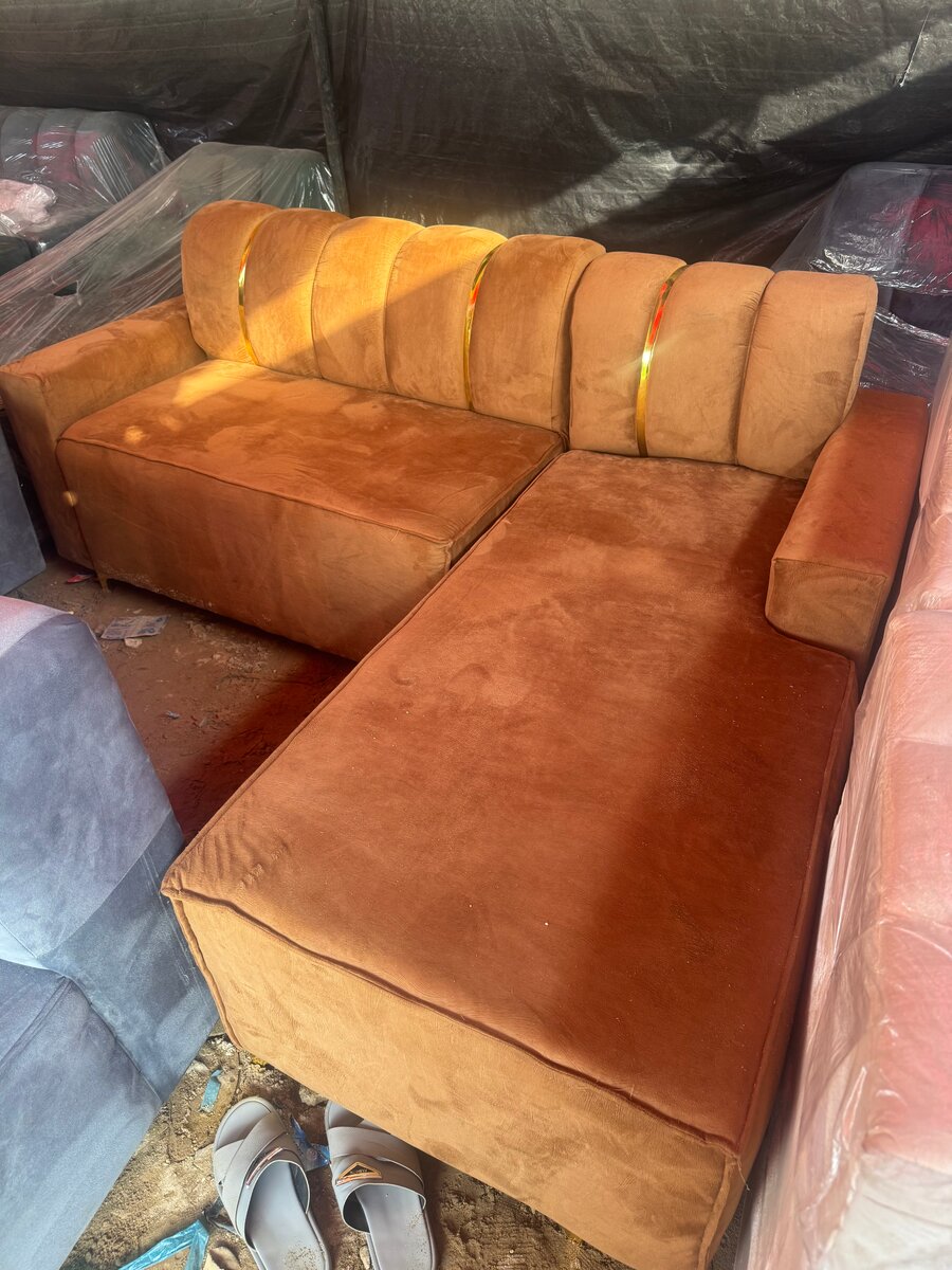 Canapé d'angle en velours marron confortable et élégant, idéal pour votre salon. Conçu pour offrir un espace de détente spacieux et cosy.