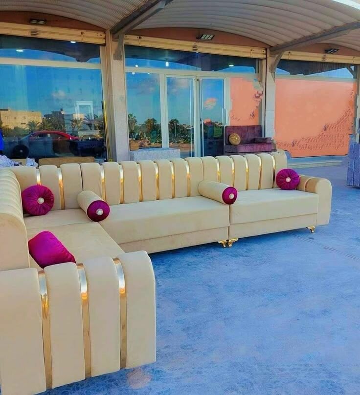 Ce magnifique canapé d'angle beige est parfait pour embellir votre salon avec élégance. Conçu pour un confort ultime, il est doté de coussins moelleux et de finitions dorées pour une touche luxueuse. Idéal pour se détendre avec style ou recevoir des invités. Sa grande capacité d'accueil le rend parfait pour les grands espaces et les moments conviviaux.
