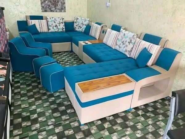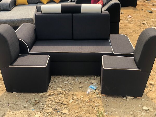 Canapé d'angle marron en tissu avec coins arrondis et deux fauteuils assortis. Conçu pour un salon confortable et moderne.