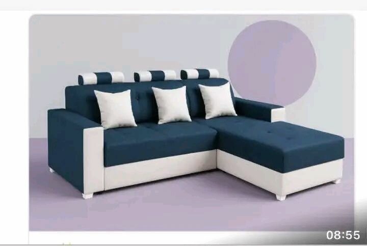 Canapé d'angle moderne avec ottomane, revêtu de tissu bleu et pieds blancs. Conçu pour le confort, il est idéal pour les salons modernes. Facile à assembler, il offre un espace généreux pour se détendre.