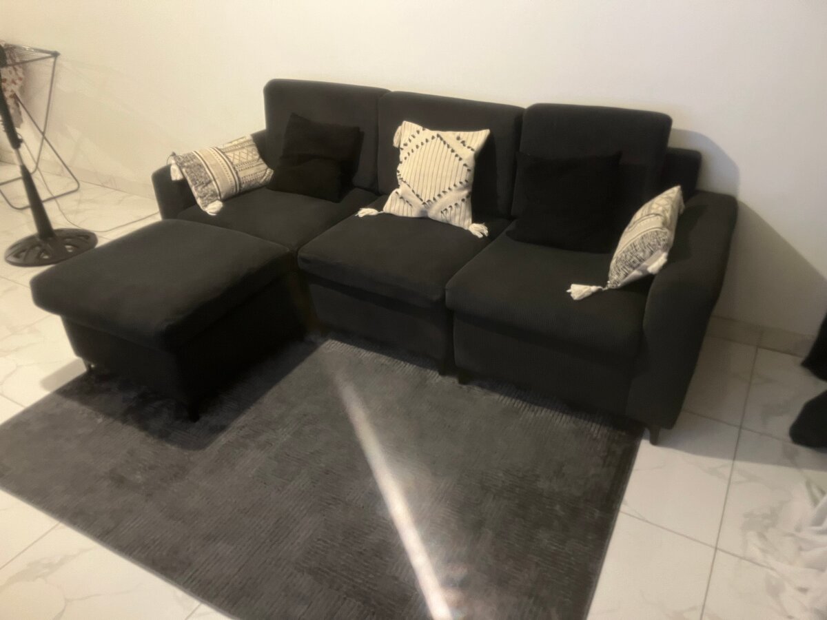 Canapé quasi neuf Améliorez votre salon avec ce canapé d'angle moderne et élégant en tissu noir. Confort et style s'unissent pour offrir une pièce parfaite pour votre espace de vie. Les coussins élégants ajoutent une touche de sophistication.