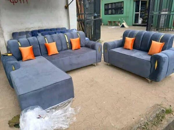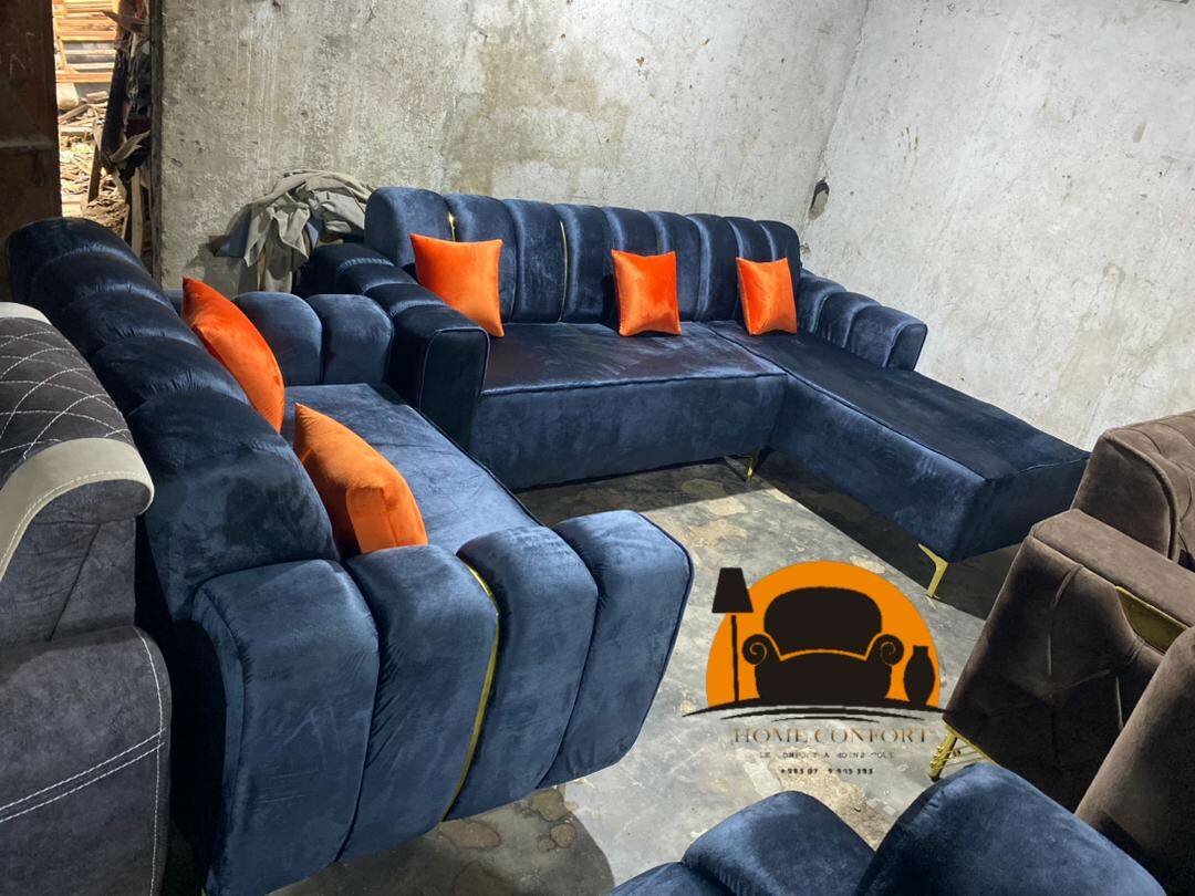 Magnifique canapé d'angle en velours bleu foncé avec coussins orange. Confort ultime pour votre salon, idéal pour les soirées en famille ou entre amis. Design élégant et spacieux, parfait pour tout intérieur moderne.