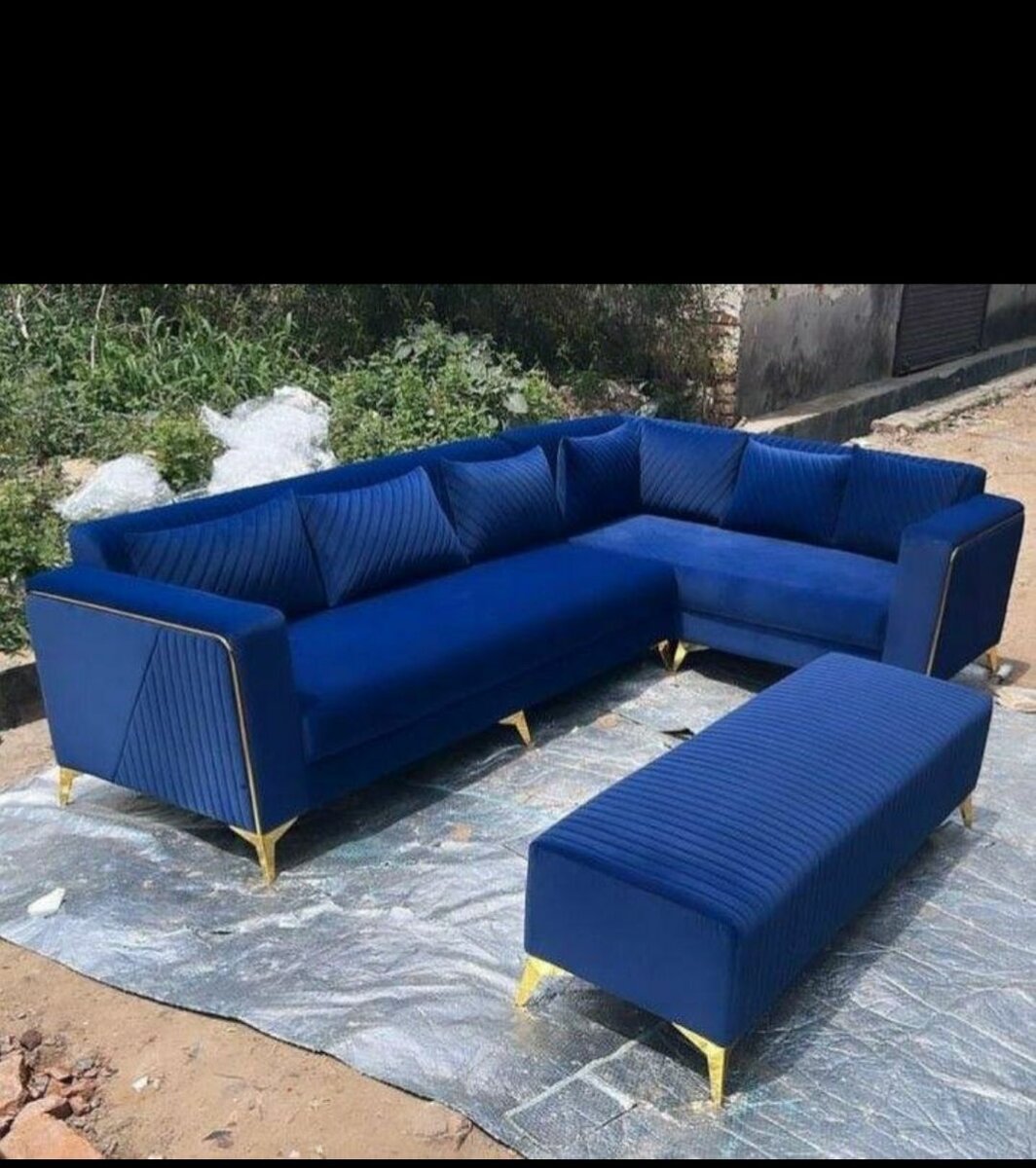 Ce canapé d'angle bleu avec repose-pieds est idéal pour un salon élégant et confortable. Fabriqué avec des matériaux de haute qualité, il offre un confort optimal et un design moderne. Les pieds dorés ajoutent une touche de luxe, parfaite pour tout intérieur contemporain.
