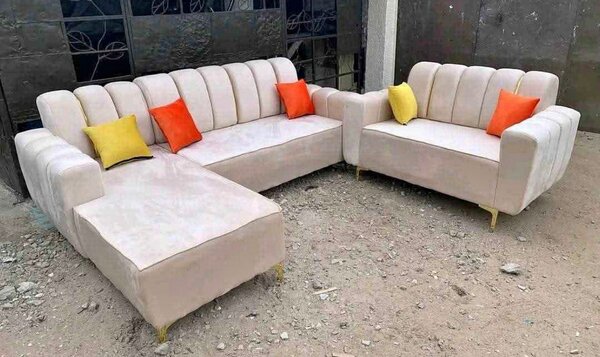 Transformez votre salon avec ce canapé d'angle moderne et élégant. Revêtement doux et confort supérieur, idéal pour les réunions de famille ou de détente. Coussins orange inclus pour une touche de couleur vive. Parfait pour tout intérieur moderne.