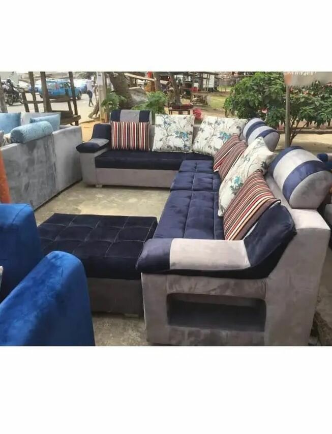 Ce canapé d'angle en velours offre confort et élégance. Idéal pour les salons modernes, il dispose de coussins décoratifs et de poufs assortis, parfait pour les grandes familles ou les soirées entre amis.
