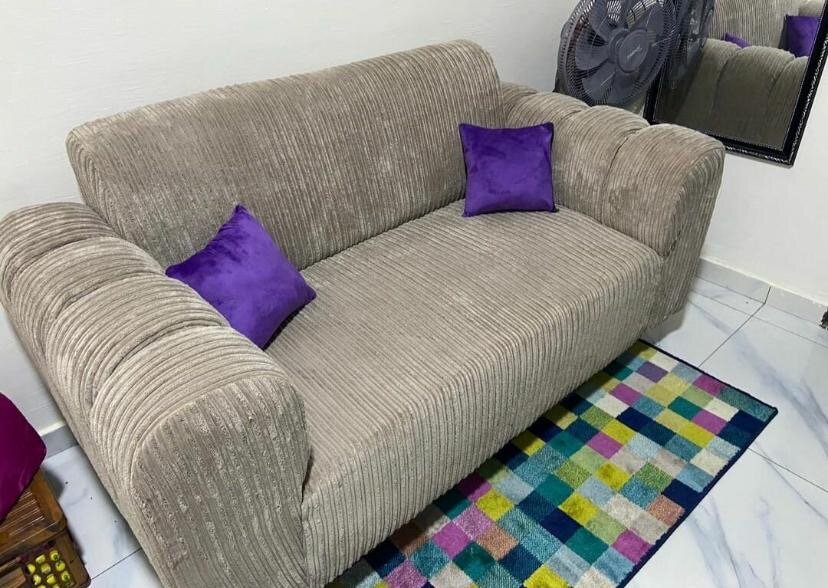 Ajoutez une touche d'élégance à votre salon avec ce canapé en tissu côtelé. Confortable et stylé, il inclut des coussins violets pour un contraste vibrant. Parfait pour se détendre après une longue journée. Idéal pour les petits espaces.
