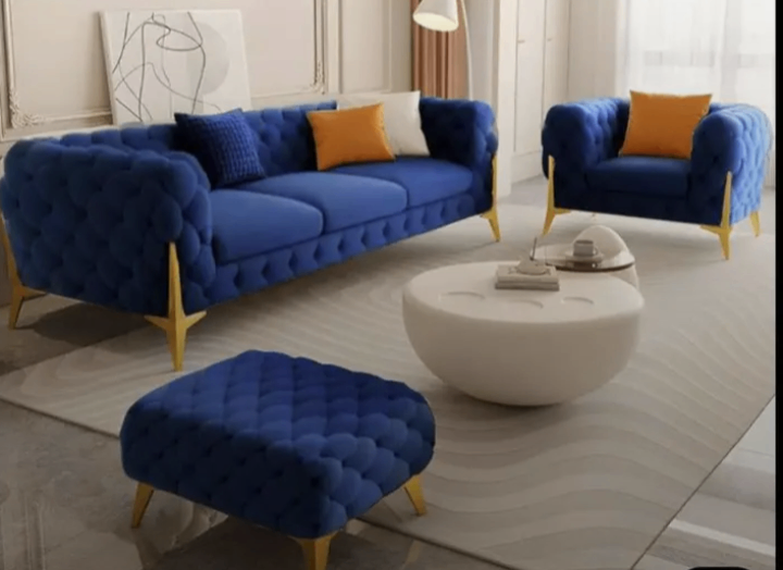 Découvrez notre canapé en velours bleu, un meuble élégant et confortable pour votre salon. Conçu pour un style moderne et luxueux, il est idéal pour les intérieurs chics. Profitez de son design capitonné et de ses pieds en or pour une touche d'élégance supplémentaire.