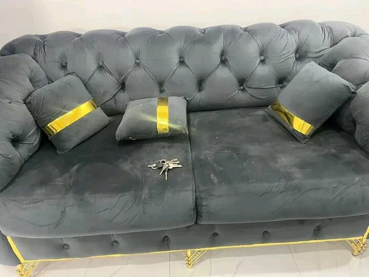 Élégant canapé capitonné en velours pour un salon moderne. Pieds dorés et coussins assortis pour un confort optimal. Idéal pour une décoration intérieure sophistiquée.