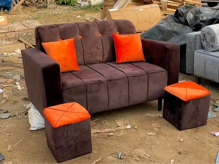Ensemble canapé et poufs gris et orange