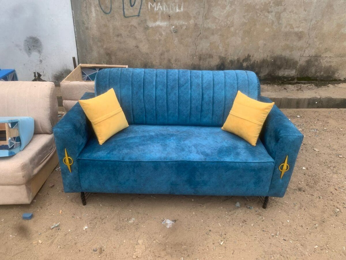 Ajoutez une touche d'élégance à votre salon avec ce magnifique canapé en velours bleu. Doté de deux coussins jaunes pour un contraste saisissant, ce canapé allie confort et style. Parfait pour recevoir des amis ou pour se détendre après une longue journée, il deviendra rapidement le point central de votre espace de vie.