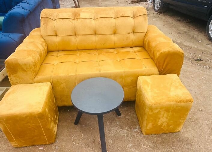 Apportez une touche de style et de confort à votre espace avec ce canapé moderne en velours jaune. Parfait pour un salon accueillant, il est complété par deux poufs assortis et une table basse. Idéal pour des moments de détente ou des discussions entre amis. Transformez votre intérieur avec cet ensemble élégant et vibrant.