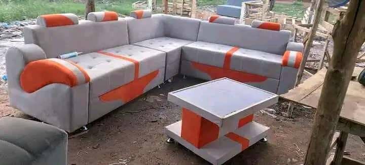 Canapé modulable gris et orange pour salon moderne. Conçu pour le confort et la flexibilité, il s'adapte à vos besoins. Design élégant et matériaux de qualité.