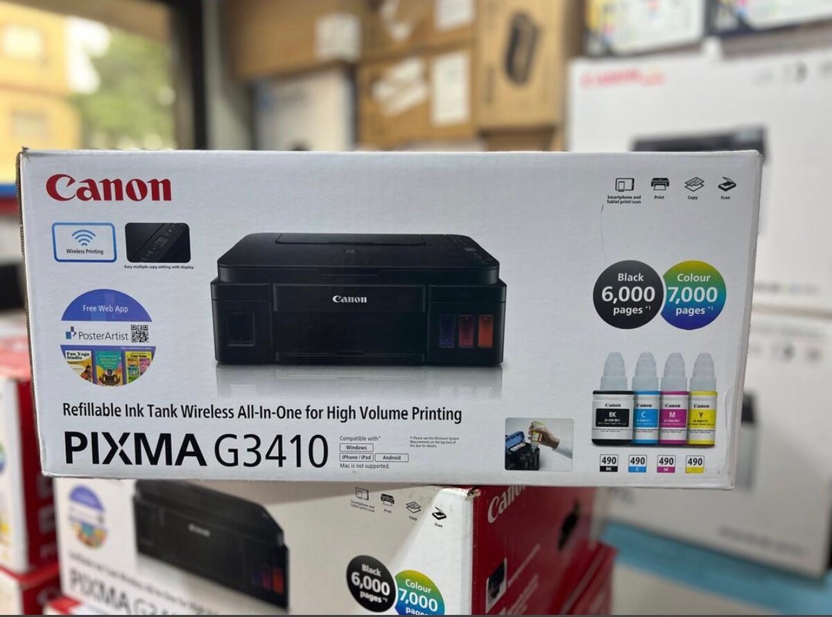 Imprimante Canon Pixma G3410 avec réservoirs d'encre rechargeables pour impression sans fil à haut volume. Parfaite pour la maison ou le bureau, elle offre une impression économique et de qualité avec capacité jusqu'à 6000 pages noires et 7000 pages couleur.