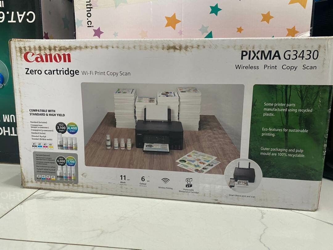 Découvrez la Canon PIXMA G3430, une imprimante sans fil optimisée pour l'impression, la copie et la numérisation. Utilisant des bouteilles d'encre pour une impression plus économique, elle est idéale pour la maison ou le bureau. Écoresponsable avec son emballage 100% recyclable.