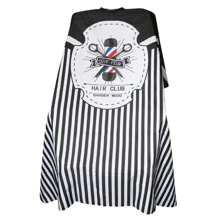 Cape de coiffure professionnelle, idéale pour salons de coiffure et barbiers. Design élégant à rayures et fermeture ajustable pour un confort optimal. Protège efficacement les vêtements pendant la coupe et le coiffage.