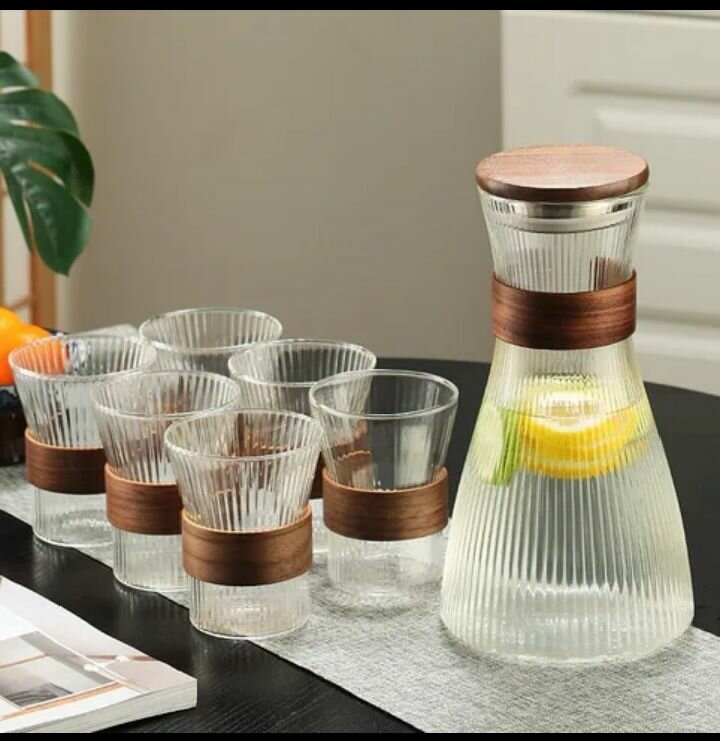 Élégante carafe en verre avec six gobelets assortis, conçue pour sublimer vos moments de dégustation. Idéale pour servir de l'eau, des jus ou des cocktails. Sa finition avec des bandes boisées ajoute une touche de sophistication parfaite pour votre salle à manger ou votre cuisine. Un choix parfait pour les réceptions comme pour un usage quotidien.