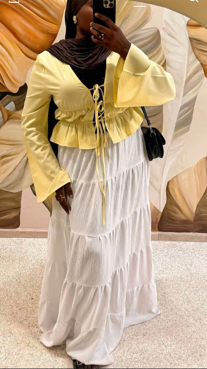 Ce cardigan fluide jaune avec sa coupe évasée est parfait pour un look élégant et décontracté. Idéal à porter avec une jupe longue ou un jean pour une touche de fraîcheur au quotidien.
