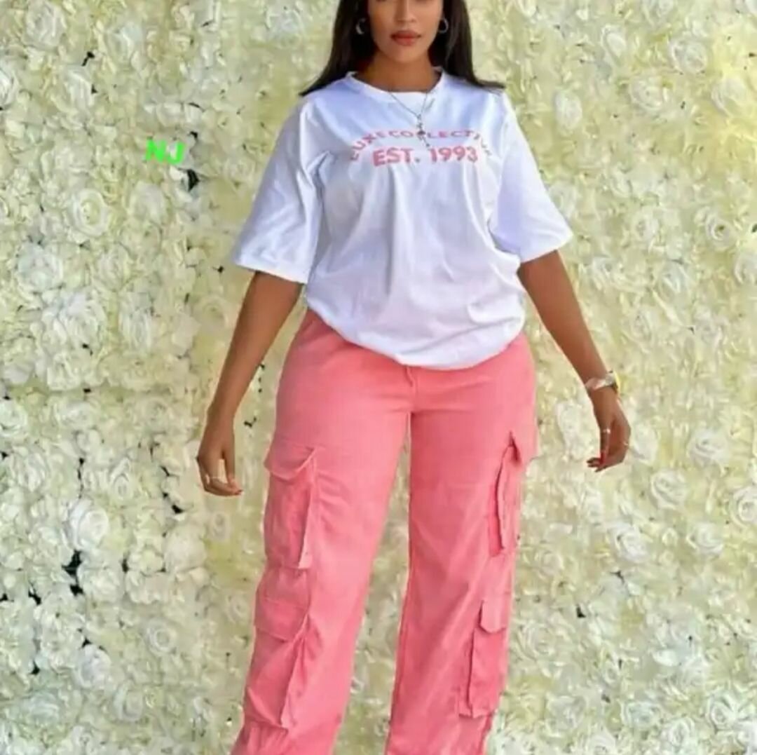 Pantalon cargo rose tendance avec poches spacieuses, idéal pour un look décontracté et chic. Confort et style pour toutes les occasions.