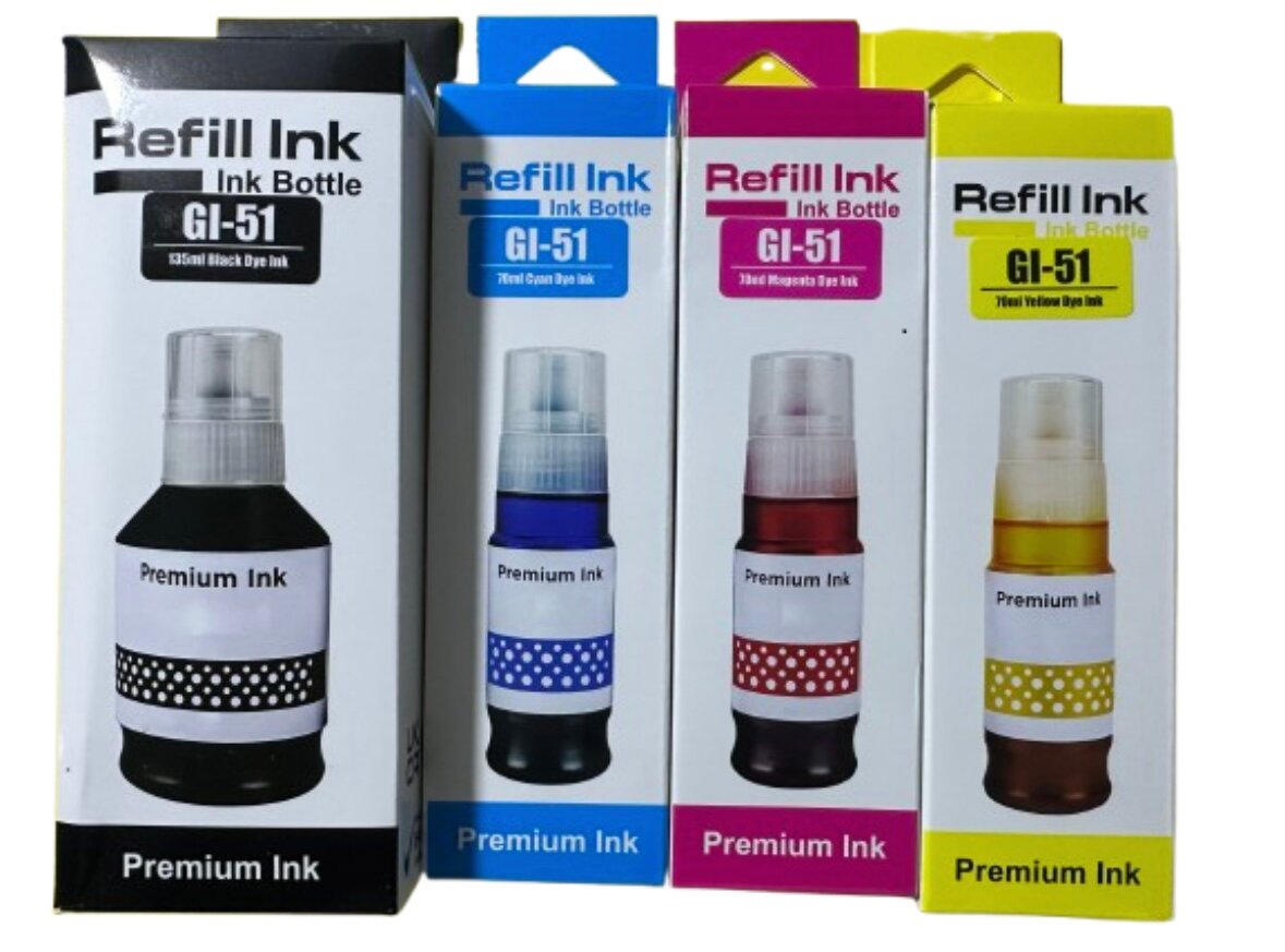 Rechargez votre imprimante avec nos cartouches d'encre de haute qualité GI-51. Disponibles en noir, cyan, magenta et jaune. Compatible avec de nombreuses imprimantes.