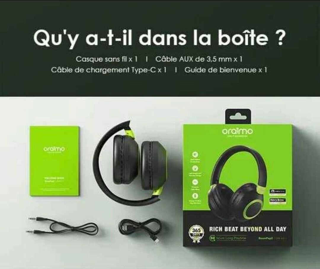 Découvrez le casque Bluetooth Oraimo pour une expérience sonore immersive. Profitez de basses puissantes et riches jusqu'à 40 heures avec la technologie AniFast™ pour une charge rapide. Connexion multi-appareils et mode jeu inclus. Idéal pour les longues journées de mobilité et de divertissement.