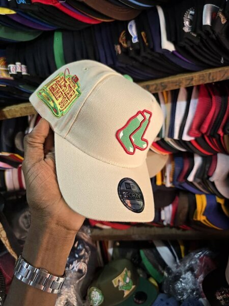 Casquette beige avec patch chaussettes rouges brodé. Style casual, réglable à l’arrière, ajoute une touche vintage à vos outfits. Article neuf.
